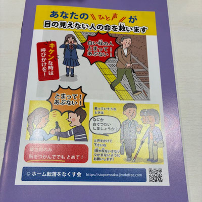 「ホーム転落をなくす会」では視覚障害者のホーム転落事故をなくすために、声のかけ方やサポートの仕方などを広めています。ぜひご協力をお願いいたします。